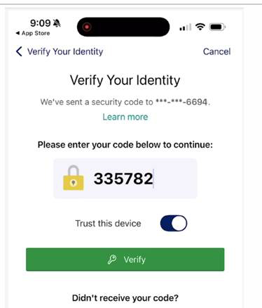 • Then, verify the code was sent to the correct cell phone number or email address. The verification screen on your MyCarle will have the last 4 digits of the cell phone or email address code was sent to.